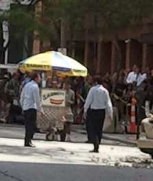 We found a perfect viewing spot to eat our lunch and had a front row seat (spectator seating is rare) to what was to be the smashing of a fully operational hot dog cart by a large plate of steel, the kind used for covering construction holes in the pavement.